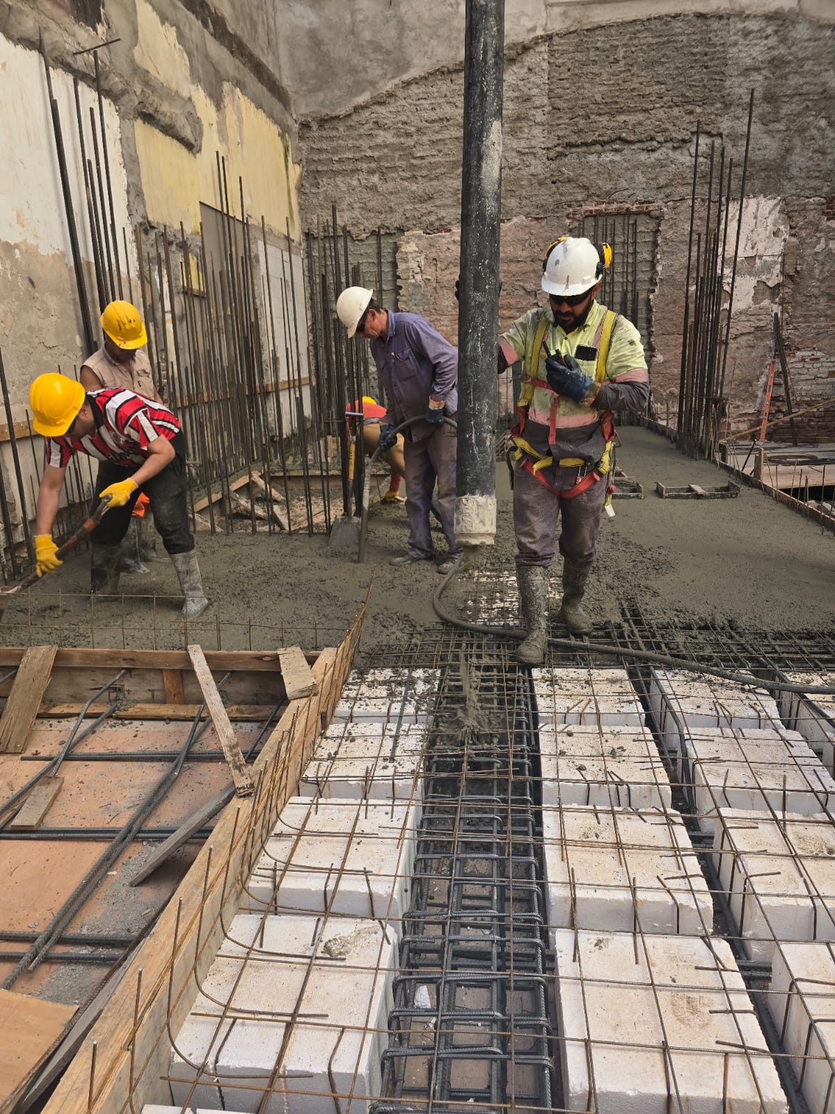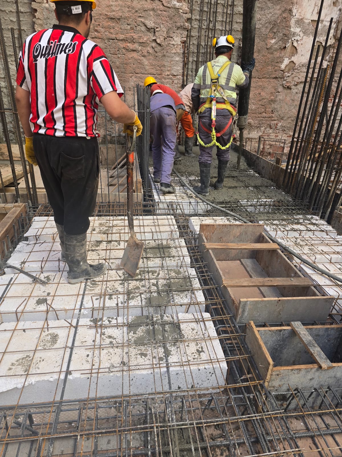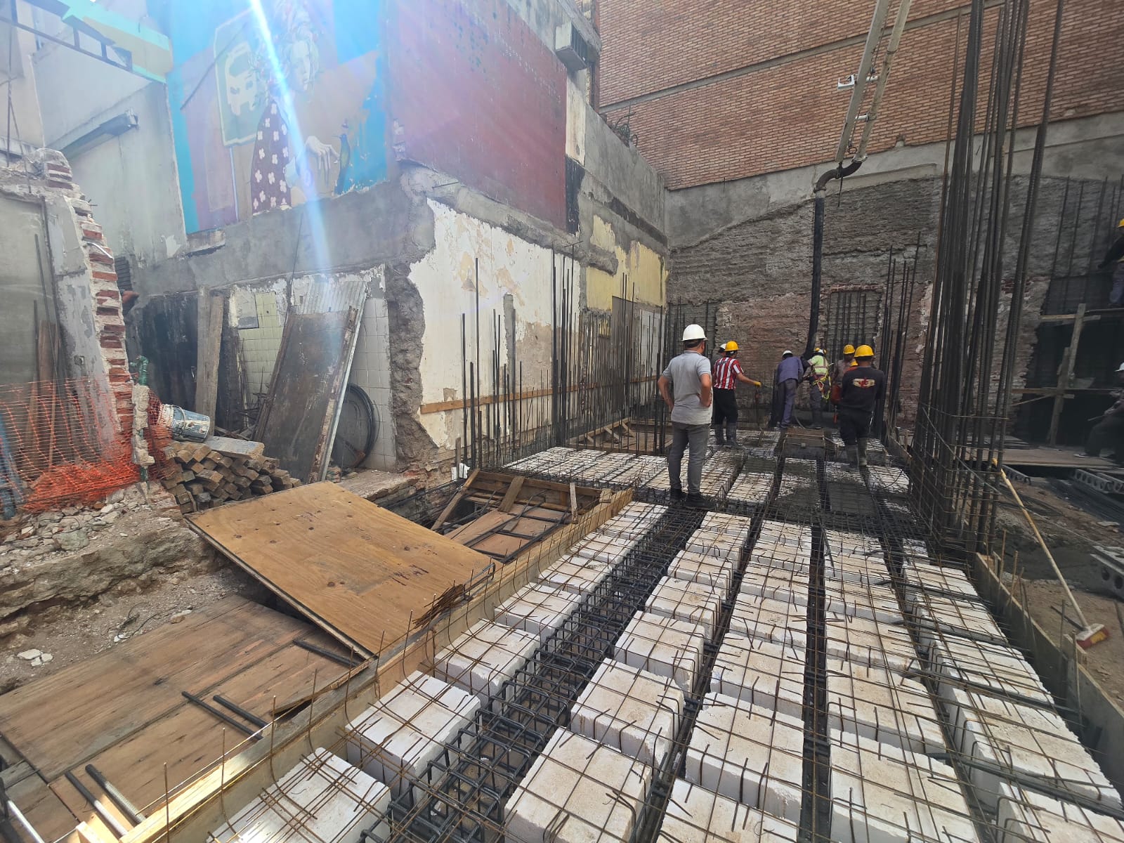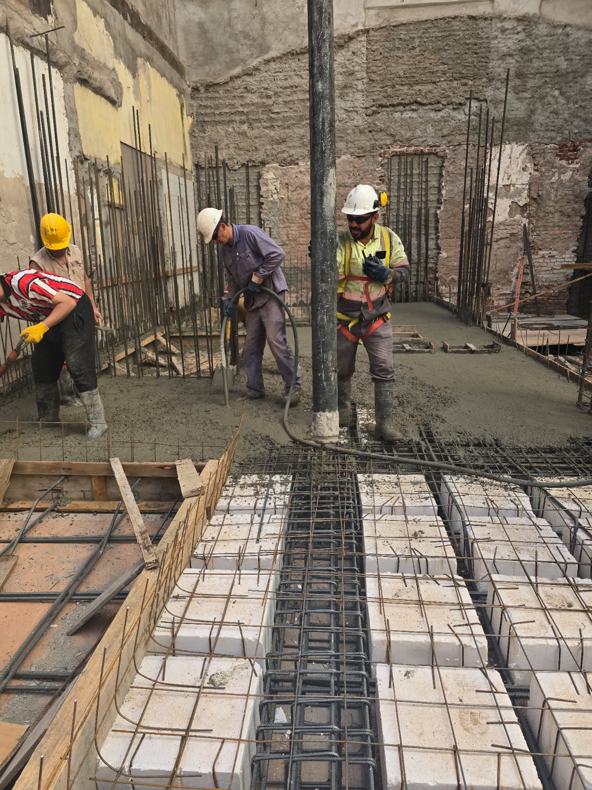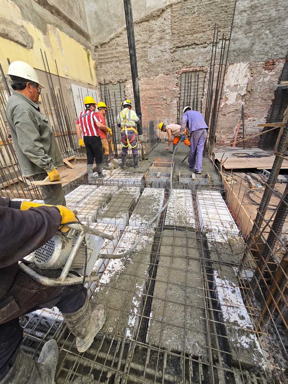 Se ejecutó el llenado de la losa sobre subsuelo en la mayor parte de su superficie, quedando pendiente un sector crítico que se resolverá en una segunda etapa. Actualmente nos encontramos trabajando en la finalización de ese sector, lo que permitirá avanzar con la losa sobre planta baja.